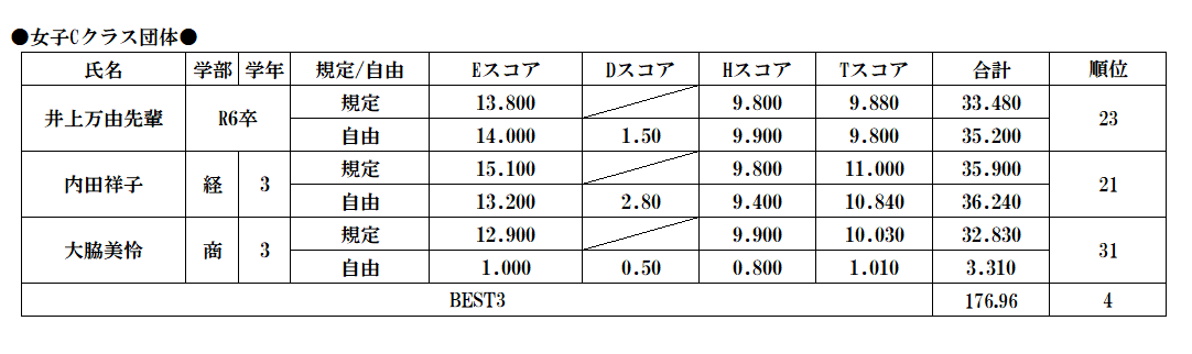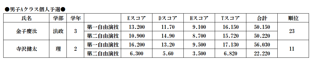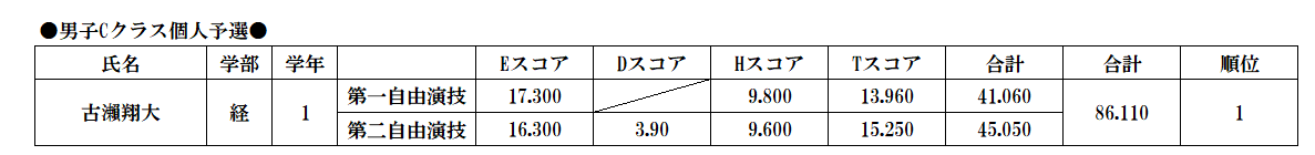 自由演技では37.3点を出すことを目標に臨んだ。1本目で大きく後方に移動し、膝が曲がり、開きが不十分であった。2本目でブルーマットに触れたため1種目中断となった。普段の練習の際に緊張感を持って臨み、通しの回数もこなしてきていたがそれで慢心してしまったことが結果に現れた大会であった。今後は現状に慢心せず、本番でも練習どおりの演技ができるように気を引き締めて練習していきたい。