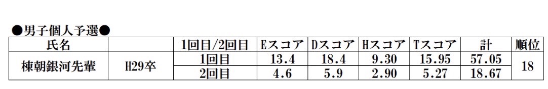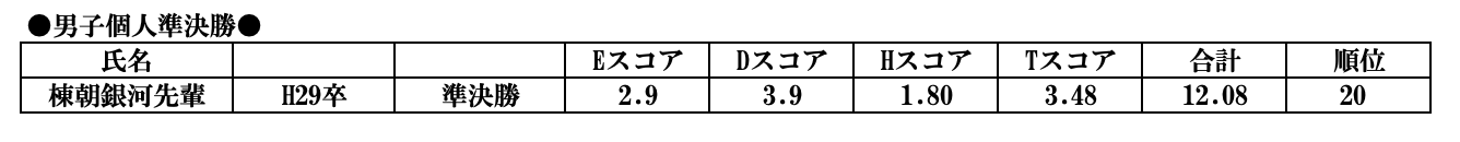 また、今大会には棟朝銀河先輩(H29卒)が男子個人に出場いたしました。
